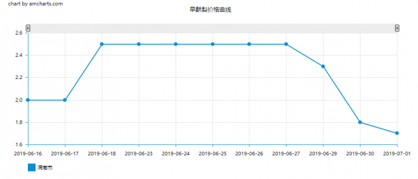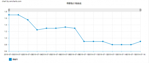 根據(jù)目前的情況可對后期早酥梨的價(jià)格可以做出簡單推斷:大致行情會穩(wěn)定早7月10日~7月16日的價(jià)格曲線圖上(均價(jià)0.8~0.9元左右/斤)。