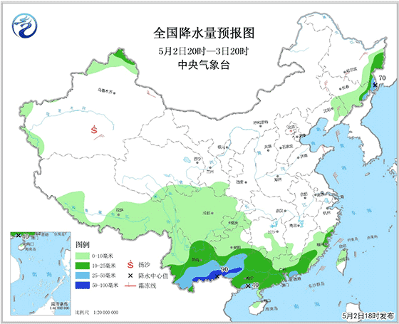 5月2日西瓜行情:先關注一下天氣,未來三天(5月2日-5月5日),廣西云南等地有較強降水,受季風槽東移影響,5月2日夜間至3日,云南東部和南部、廣西中西部等地的部分地區有大到暴雨、局地大暴雨,上述局部地區將伴有短時強降水、雷暴大風等強對流天氣。東部南部海區有大風,受氣旋和冷空氣影響,5月2日夜間至4日夜間,黃海、東海、臺灣海峽、南海東北部海域將有6~7級、陣風8級的東北風。全國降水量預報圖見下圖: