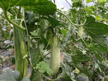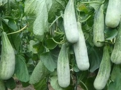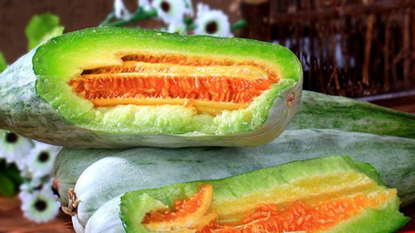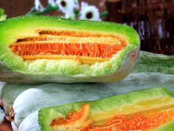 羊角蜜甜瓜單體長二三十厘米,單瓜重可達600~1200g,植株長勢強,子蔓結瓜,雌花密。果皮灰綠,肉色淡綠,內厚2cm,含量11.7%,質地松脆,汁多清甜,品質優;單瓜重600g,畝產3000kg以上。