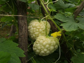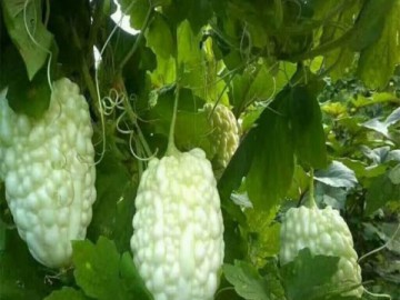 新一代交配品種,蘋(píng)果型苦瓜,果面密生亮白珍珠粒,糖度***6度,口感脆甜多汁,果型粗肥,肩形美,早生,生長(zhǎng)強(qiáng)健,結(jié)果能力強(qiáng),采收期長(zhǎng),亮麗美觀,單果重500克左右,開(kāi)花至采收約18天。 肉特厚,苦味清淡適中,口感略有甜爽清涼生津,水分多,適合榨汁飲用,遮光后皮色更為潔白嬌艷,可愛(ài)***,全身呈乳白色,看起來(lái)像白玉雕刻的一樣,上面的紋路特深,瓜果面上瘤點(diǎn)似粒粒珍珠般,因此有珍珠白玉苦瓜之稱(chēng)。