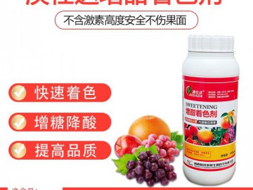 3、葡萄增甜著色使用時間:葡萄轉色期;檢驗標準:10%~20%出現紅絲時,稀釋1000-1200倍整株噴施,著色期使用1-2次。使用后葡萄上色快、果粉均勻、不軟果、不掉粒、不裂果、甜度好、提高果實含糖量2-5度,提高VC含量7%-30%,耐貯運。